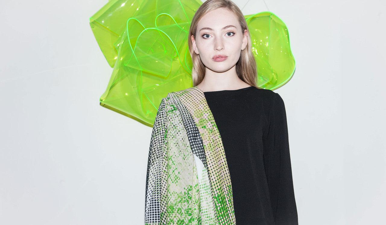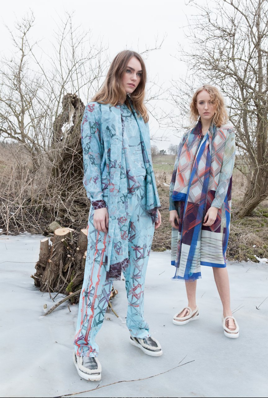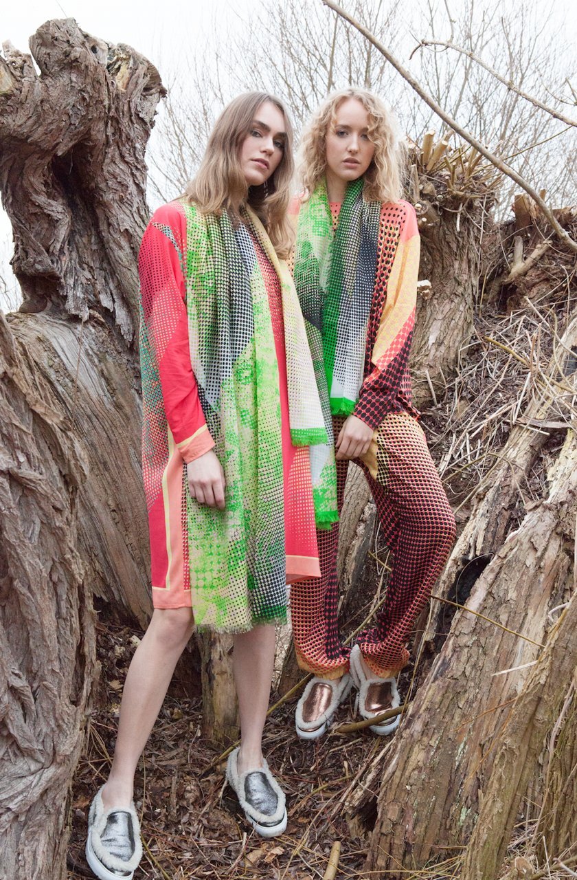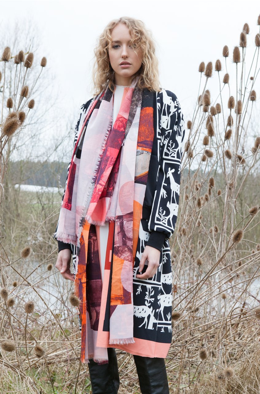 The entire production process takes place in Germany. After the printing process the cloths and scarves are further edited in Berlin carefully according to the design specifications of the designer until they are finished by hand fraying in the Uckermark. Due to the computer controlled Injection-Print-Method of the latest generation solely OEKO-Tex 100 and GOTS certified non-toxic paints can be utilized. All the materials are antiallergic, breathable, antistatic and skin sensitive.